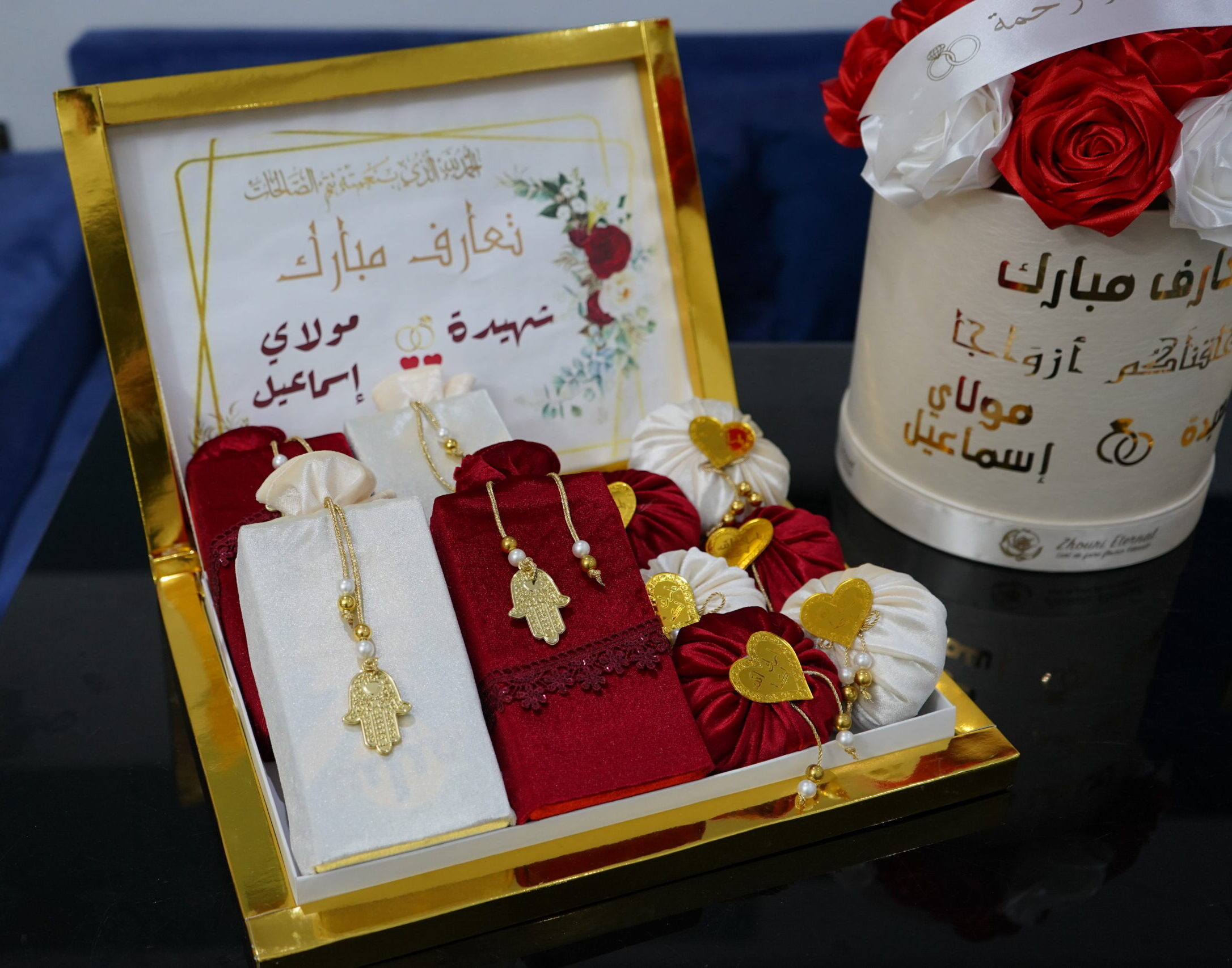 Fiançailles, taarouf, petites cérémonies intimes, cadeaux élégants pour couple.