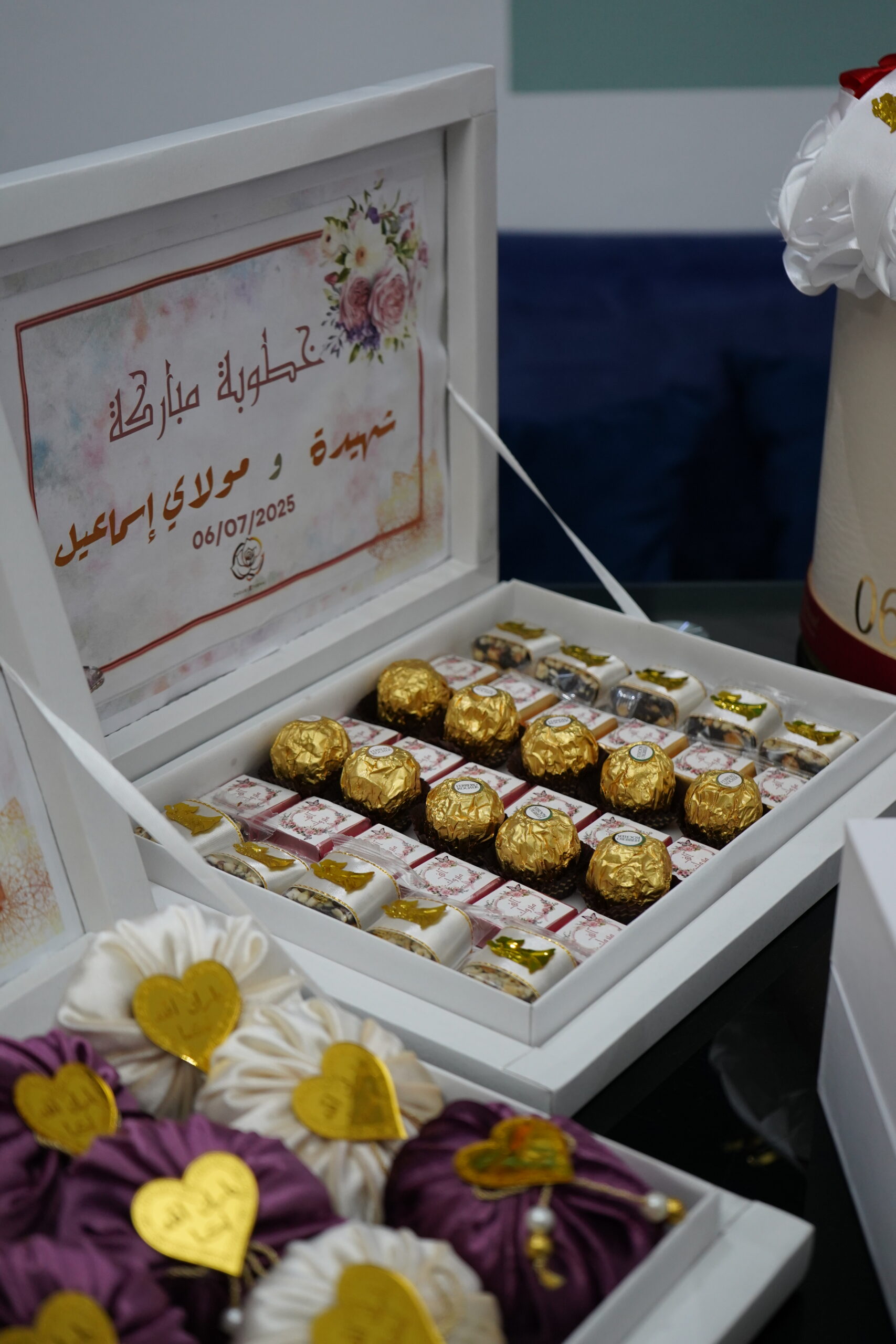 Un coffret pensé pour la douceur et l’élégance. Le Pack Medium combine fleurs éternelles, douceurs gourmandes et accessoires traditionnels pour un cadeau complet qui marquera vos fiançailles ou votre taarouf d’une touche raffinée et personnalisée.